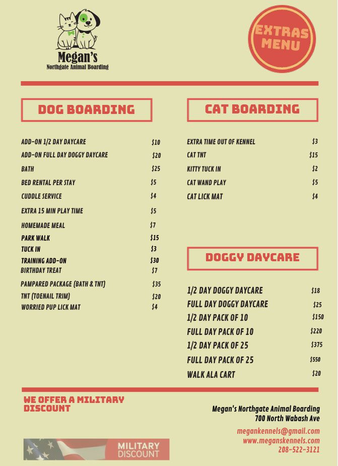 Posted on Susan D.Trustindex verifies that the original source of the review is Google. Megan and her staff have been amazing! We've taken our 2 dogs for daycare 3 times and the dogs did very well with the other dogs. Staff is very attentive and was able to tell us how each of our dogs did with the other dogs in the play sessions when we picked them up. Whenever, I've call to ask questions about daycare or boarding, Megan and her staff have been patient and thorough in answering my questions. I love all the daily photos she posts of the pets playing that you can see once you log into the reservation booking software. I can tell Megan and her staff really care about the pets in their care and their customers too. We will definitely be using Megan's Boarding & Daycare in the future.Posted on Patty ATrustindex verifies that the original source of the review is Google. Maycie is amazing !! I brought my dog Bug to be groomed and she also helped with my cat Posie , who had a gnarly mat on her back . The entire staff was friendly and welcoming !! The best part was when picking my little friends up after grooming they were relaxed and happy , this tells me they were treated very well and Maycie handled them with care ! I have found my forever groomer at Meagan’s Northgate … Thanks ladies 😻🐶Posted on Sarah BellTrustindex verifies that the original source of the review is Google. I'm too far away to use their services but the wonderful woman I spoke with on the phone was an absolute delight. I could hear the honesty and excitement in her voice as she informed me this was the best job she's ever had "easily." I have zero doubts how amazing she and the rest of the staff looks after the animals in their care and it makes me smile (smiling as I'm writing this!) for all the owners. I've had 35 years in animal rescue, dog sitting, dog walking, fostering, and adoption. I'd trust them with my fur babies in a heart beat. Highly recommend!Posted on Jessa SmithTrustindex verifies that the original source of the review is Google. I boarded my two dogs for 7 days. We ended up having some travel complications and needed to leave them there longer. At the time, we didn't know how much longer. We were reassured that they would care for them as long as needed. We received almost daily emails with photos of the dogs and when we returned it was very obvious that our one dog prone to separation anxiety was comfortable and happy. Will be using again for sure.Posted on Tim WilliamsTrustindex verifies that the original source of the review is Google. Really great customer service, and available year round. My dog seemed very excited to see me, didn’t have any sickness or foul odors after leaving the boarding facility. I will definitely use this place again next time I go up to the Grand Tetons. They also offered me a veteran discount, much appreciated.Posted on Bill KarolyTrustindex verifies that the original source of the review is Google. We have been bringing Chip here for years and he loves it. He's always excited to come here and the staff love our dog and it shows. I would highly recommend Megans. Awesome people and our pooch is always well taken care of.Posted on Meredith WilliamsTrustindex verifies that the original source of the review is Google. Thanks for taking my cat when I go out of town. Barbie is so cute and sweet and I think Hermione likes her. Hope she gets to see her again