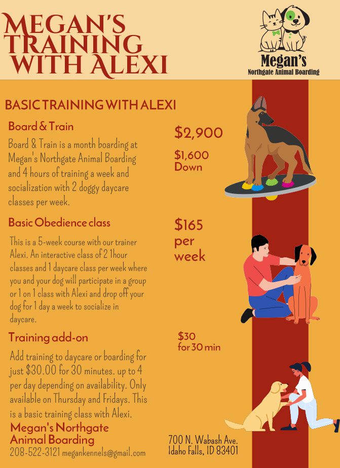 Add training to daycare or boarding for just $30.00 for 30 minutes. Up to 4 per day, depending on availability. Only available on Thursday and Fridays. This is a basic training class with Alexi.
